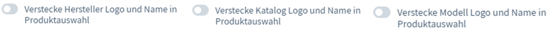 - „Produktauswahl-Einstellungen“ → Wenn Sie die Anzeige des gewählten Herstellers, Katalogs und Modells vor dem Endkunden verbergen möchten, sollten Sie die jeweiligen Schieberegler aktivieren.